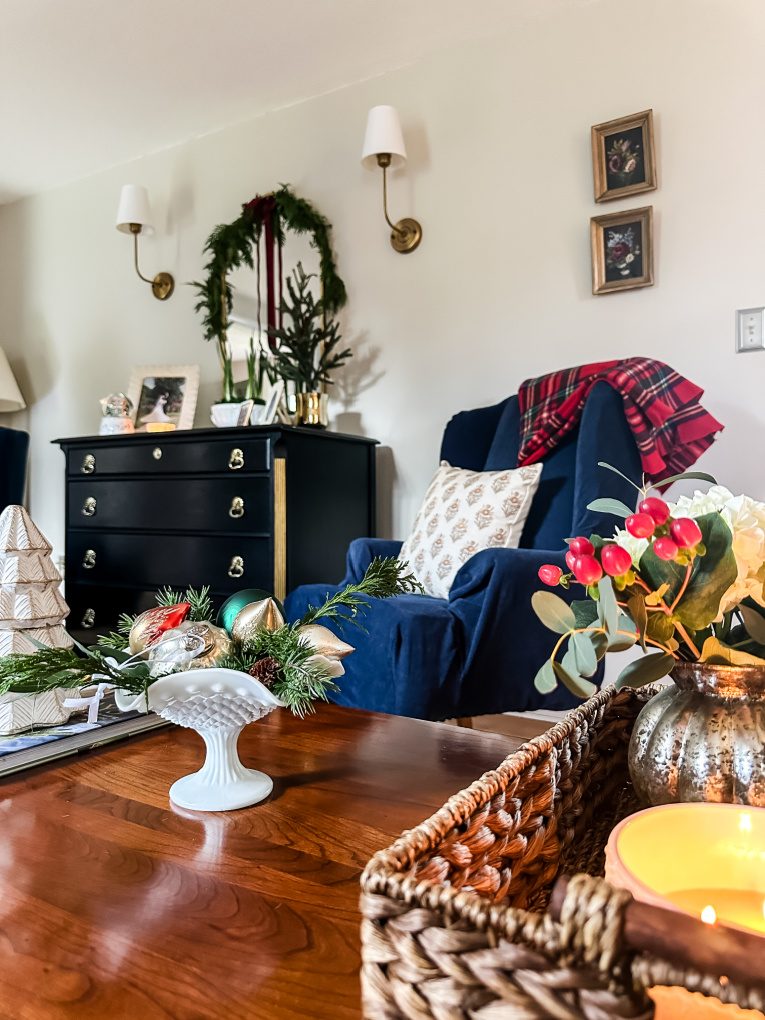 Plaid adds a festive touch to our Christmas living room, and this red plaid throw draped over the chair is extra special — it was my husband’s baby blanket!