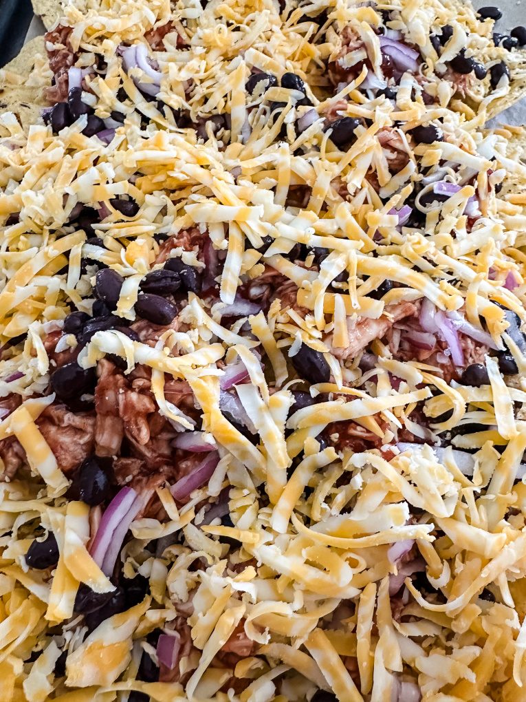 - Top the tortilla chips with BBQ chicken, thinly sliced red onion, and black beans.