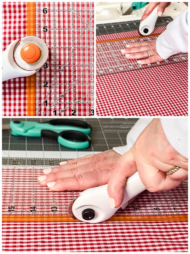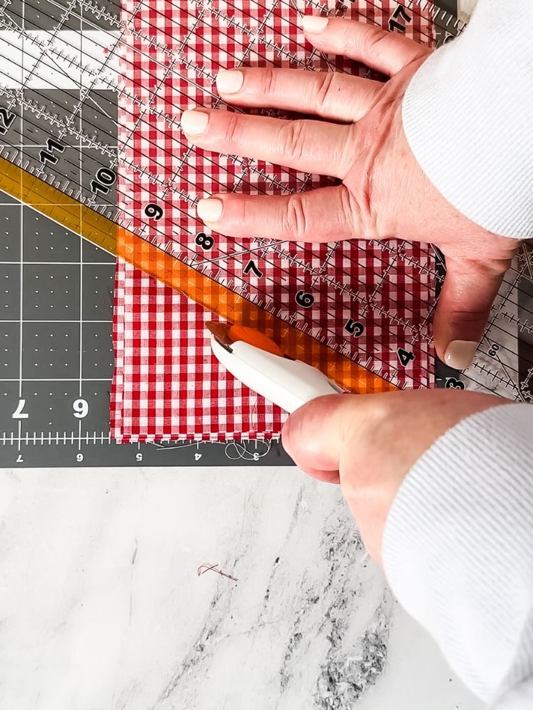 Select a fabric that fits your style. For Valentine’s Day, think soft pinks, classic reds, creamy neutrals, or playful patterns. I chose a classic red gingham pattern. I purchased 1 1/2 yards of fabric.